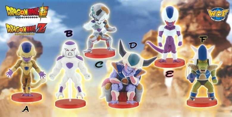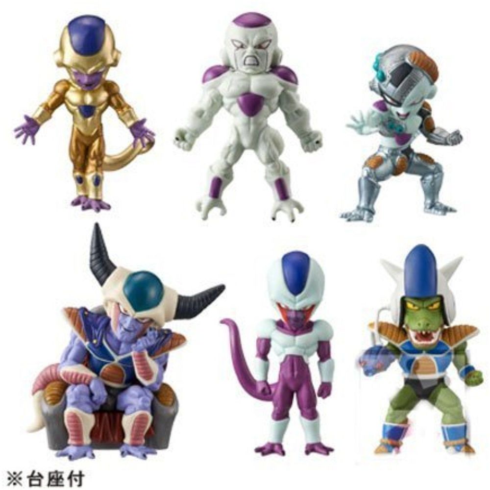 These stand about 2.8 inchs tall and the collection includes Golden Frieza from the Resurrection F movie as well as Final Form Frieza, Mecha Frieza, Frieza's brother Cooler, Blueberry and Frieza's father King Cold. (Each sold separately).