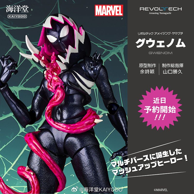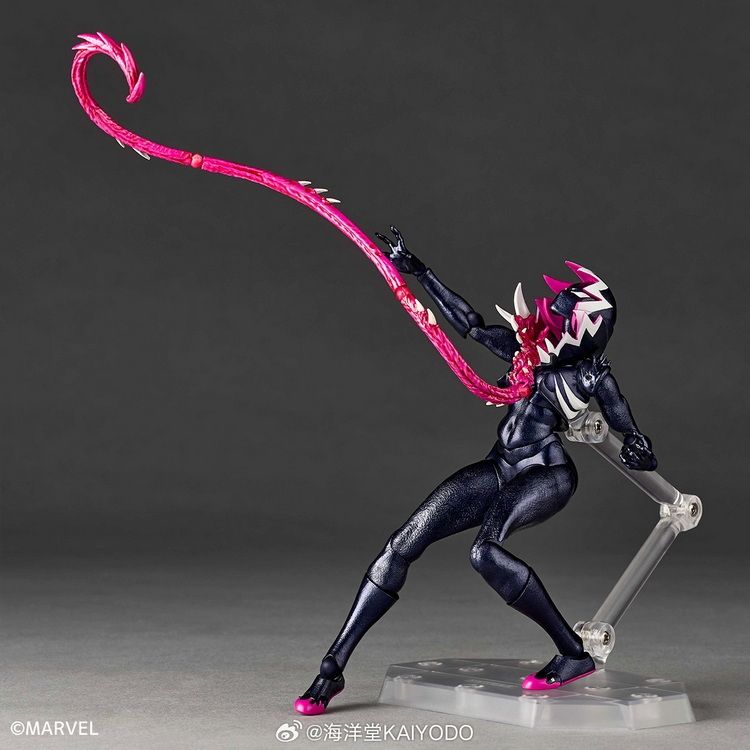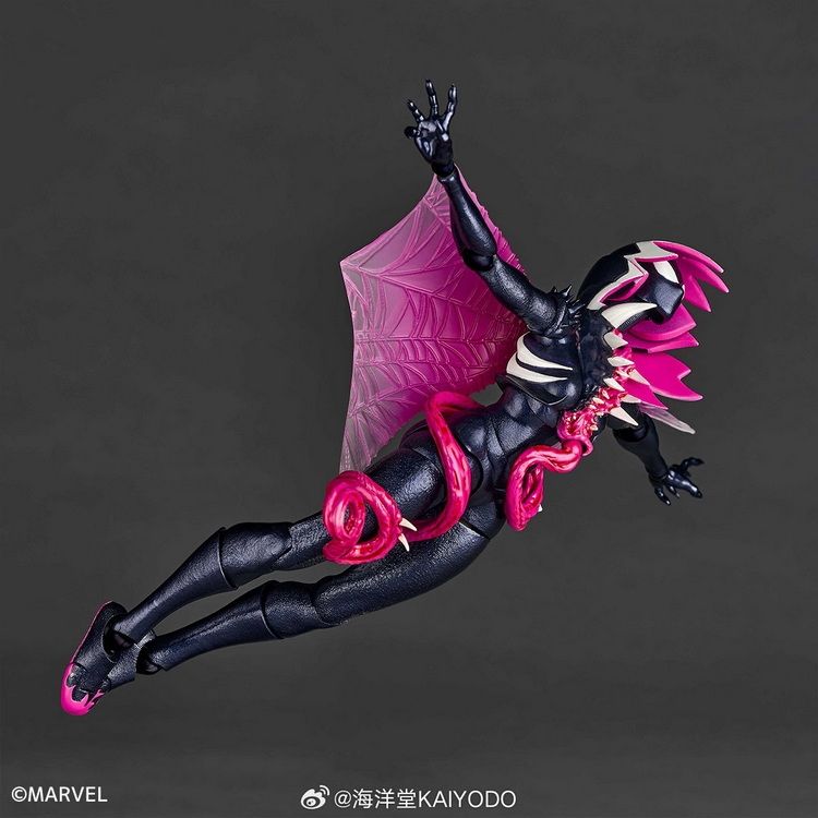 Experience the unique transformation of Gwen Stacy into Gwenom from the “Spider-Verse” series, as portrayed in the “Spider-Gwen” comics. This posable action figure captures her immersed in the symbiote with intricate detailing, featuring the iconic fanged jaw and a distinct blend of her original colors.