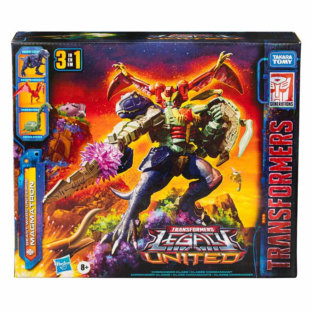 Unite your favourite characters from across the world of Transformers robots into your collection with the Transformers Legacy United Commander Class Beast Wars Universe Magmatron action figure! This 10-inch Beast Wars Universe Magmatron action figure separates into Beast Wars Universe Skysaurus, Beast Wars Universe Landsaurus, and Beast Wars Universe Seasaurus figures. Comes with Magma Blade, sword hilt, and blast effect accessories that attach in both modes. This figure is inspired by the character from the animated series, Beast Wars Neo: Super Lifeform Transformers, and features an articulated head, arms, and legs for awesome action poses. Celebrate the last 40 years of Transformers history with Transformers Legacy action figures. Transformers Legacy opens the portal to a whole new universe of -- More Than Meets the Eye -- bringing together every Transformers generation like you’ve never seen before. Collect and combine different characters to create your ideal Legacy lineup.