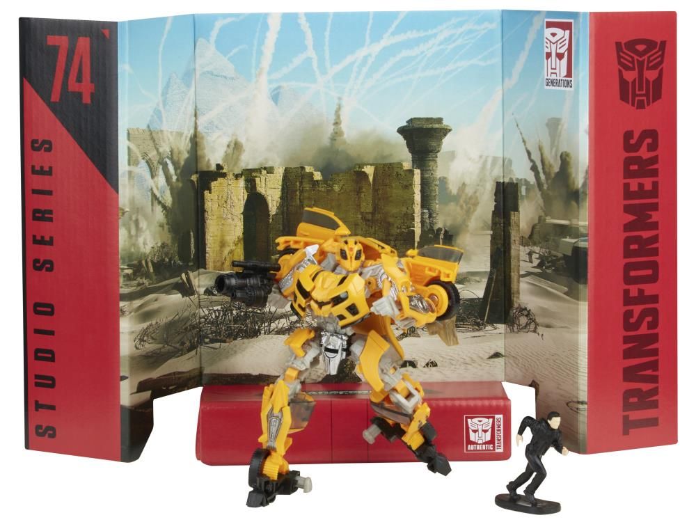 Reach past the big screen and build the ultimate Transformers collection with Studio Series figures (each sold separately), inspired by iconic movie scenes and designed with specs and details to reflect the Transformers movie universe.This Studio Series 74 Deluxe Class Bumblebee features vivid, movie-inspired deco and includes a blaster accessory and non-converting Sam Witwicky figure. Plastic 4 1/2-inch Bumblebee figure converts from robot to licensed Chevrolet Camaro mode in 39 steps. Remove backdrop to showcase Bumblebee and Sam Witwicky figures in the Pyramid Desert Battle scene.