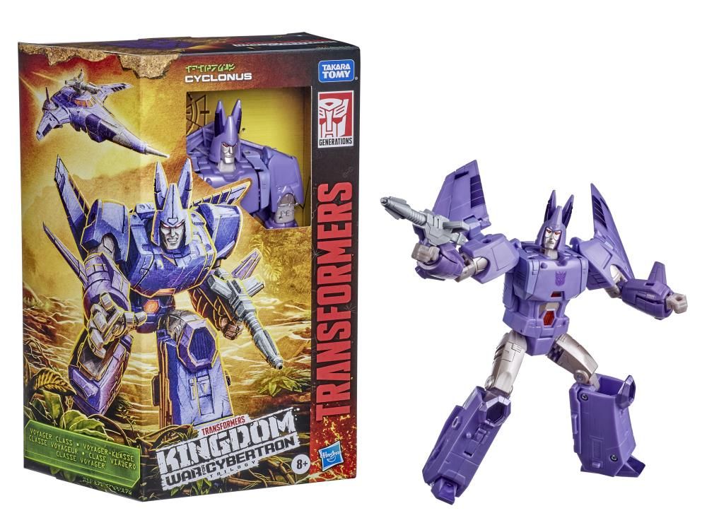Beastify the battlefield! Worlds collide when the Maximals and Predacons join the fight, coming together with the Autobots and Decepticons in an epic battle that will alter their destiny forever. Cyclonus, a Herald of Unicron, first appeared in the 1986 movie when a dead Decepticon was reformatted into the second-in-command of Galvatron. This G1-inspired toy converts into Cybertronian fighter craft mode in 34 steps and comes with Oxidating Laser accessory.Cyclonus includes a Golden Disk card that reveals a possible destiny of a key character. Collect other Kingdom figures to reveal all 3 alternate destiny variants for each character! (Each sold separately.)With the ancient and highly advanced F.O.S.S.I.L. (Fossilized Osteo-Skeletal Shield Integration Loadout) technology, Fossilizer bots, infused with primordial energy, break apart to weaponize their allies. Use Deluxe Fossilizer figures to beastify the Cyclonus figure with bone armor! (Sold separately.)